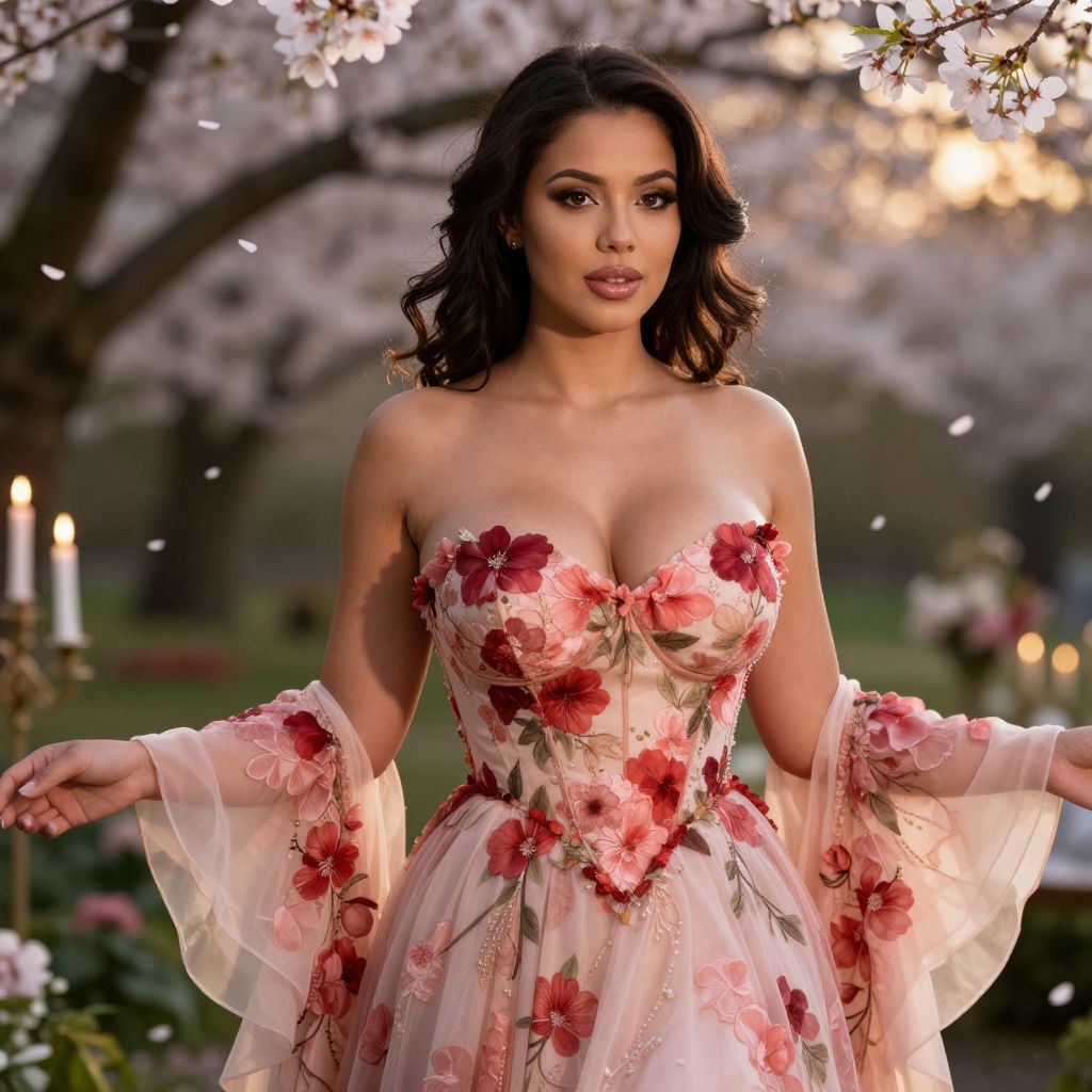 A woman stands gracefully in a floral-themed corset dress adorned with red and pink flowers, set against a dreamy backdrop of blooming cherry blossom trees. The soft lighting and delicate petals falling around her enhance the romantic and ethereal atmosphere of the portrait.