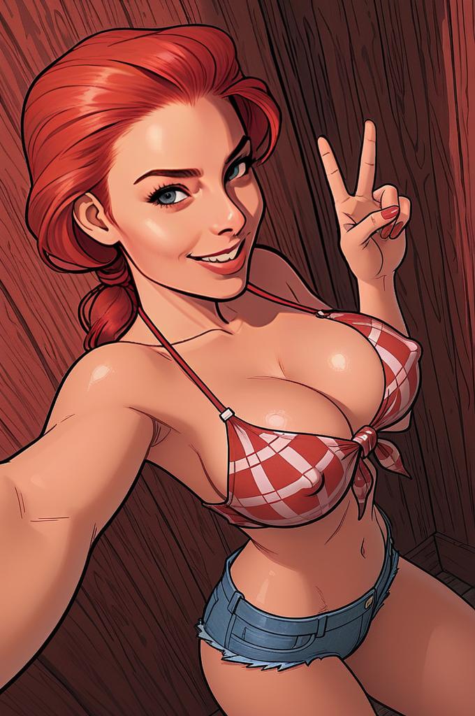 A confident red-haired woman poses for a selfie, flashing a peace sign with a playful smile. She wears a red and white checked bikini top and denim shorts, set against a wood-paneled background in vibrant comic book style art.