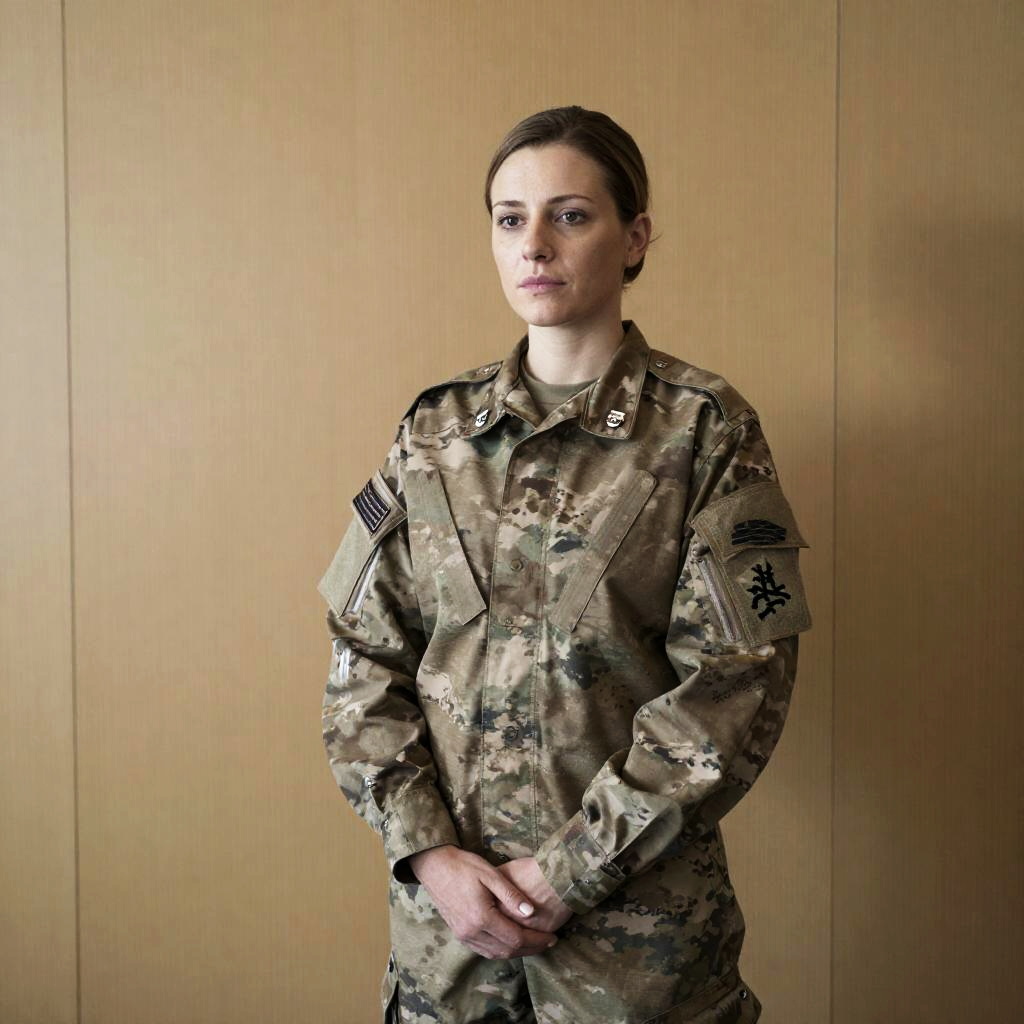 A woman stands confidently in a modern camouflage military uniform, positioned against a plain wooden wall background. She appears focused and disciplined, embodying professionalism and dedication within a military setting.
