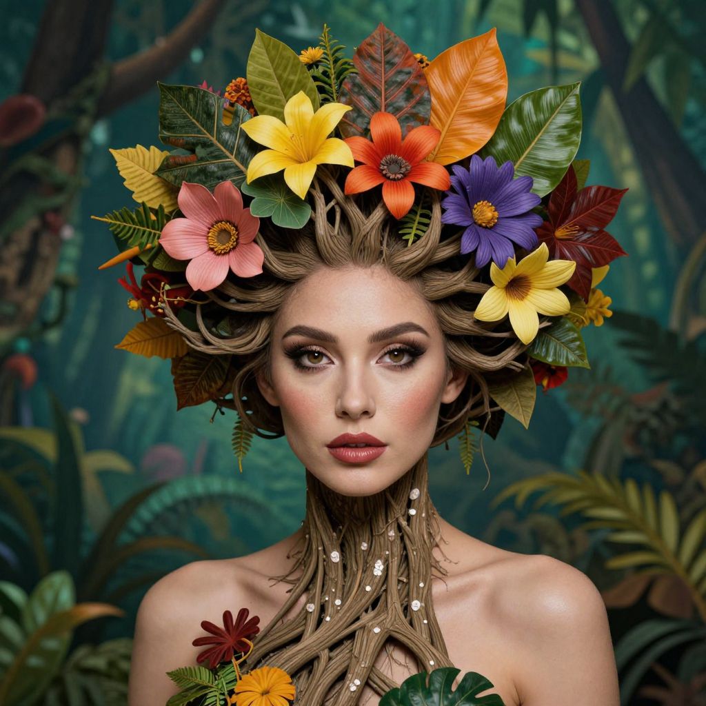A woman with an ethereal appearance is styled with hair and neck made of intertwining branches, adorned with vibrant tropical flowers and lush leaves. The image blends fantasy and nature elements in a surreal, artistic composition set against a blurred forest background.