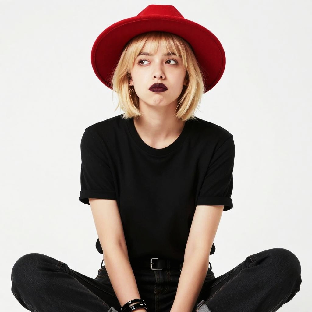 A young woman with blonde hair styled in a blunt bob wears a striking red wide-brimmed hat, paired with a simple black t-shirt and black jeans. She gazes thoughtfully to the side, embodying a modern minimalistic fashion style with a bold touch from her dark lipstick and accessories.