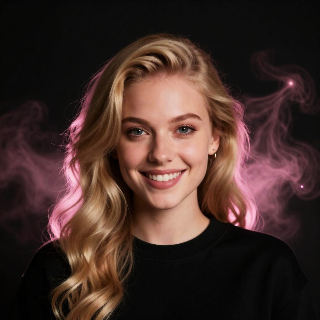 A smiling young woman with long blonde hair poses against a dark background illuminated by soft pink smoke effects that create an ethereal and modern atmosphere. The image captures a fresh and stylish vibe, characteristic of contemporary portrait photography.