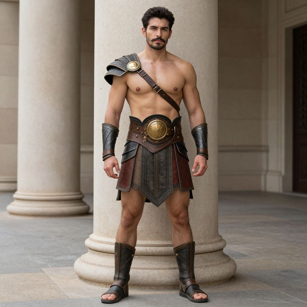 A muscular man dressed as an ancient warrior stands confidently in front of large stone columns, showcasing detailed leather armor and metal accessories including a chest strap, arm guards, and sandals. The costume reflects a classical gladiator or Roman soldier style, emphasizing strength and historical authenticity.