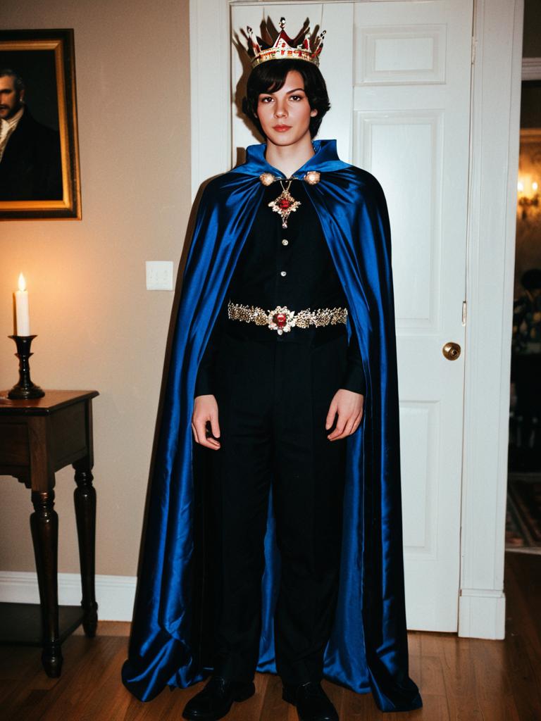 A young man stands confidently dressed in a queen-themed party costume, featuring a regal blue satin cape, an ornate crown, and elaborate gold and red jeweled accessories. The photo captures a sophisticated and vintage-inspired royal look, highlighting the detailed costume elements in an indoor setting.