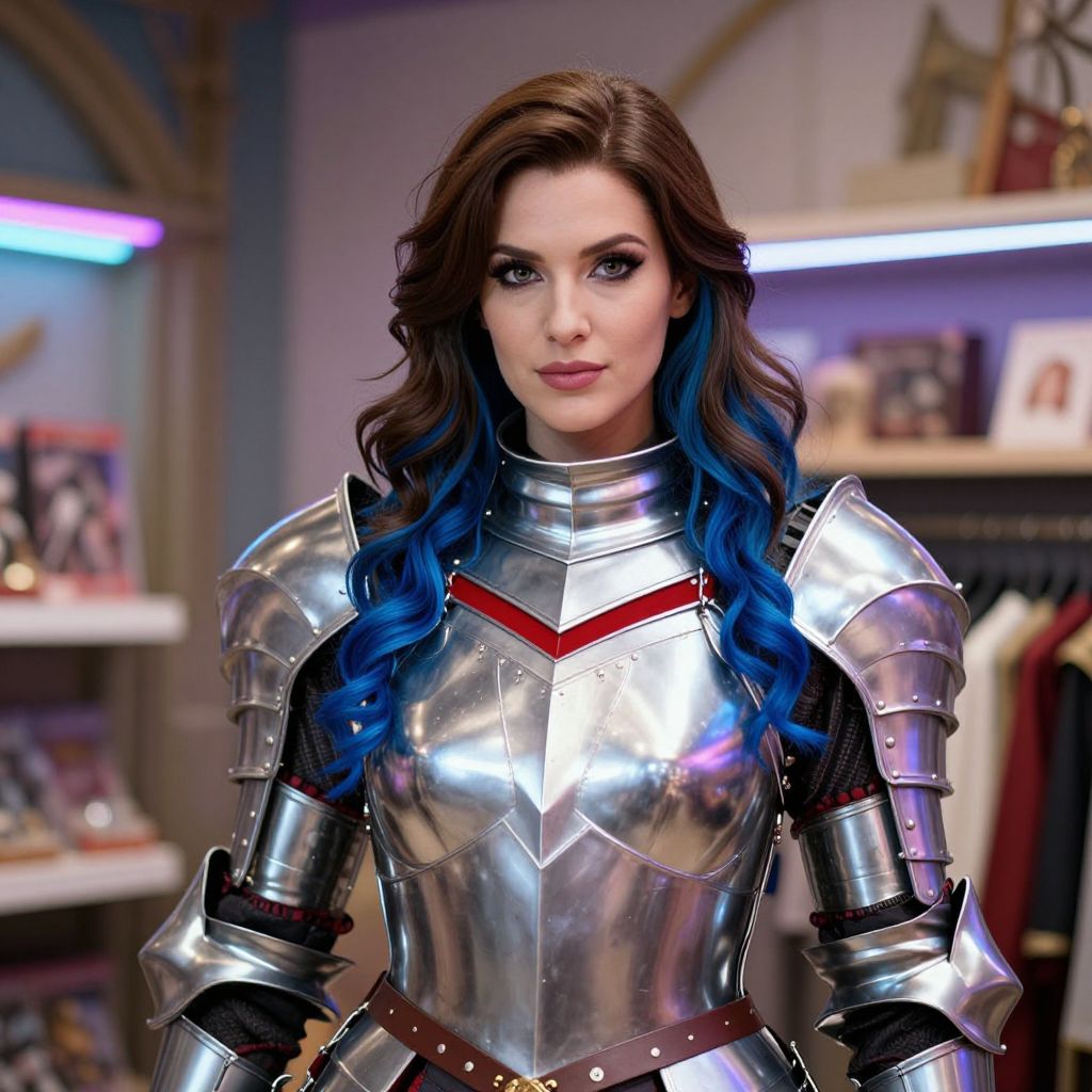 A woman stands confidently wearing polished medieval-style silver armor with intricate detailing and a red accent on the chest plate. Her long hair features vibrant blue streaks, adding a modern, fantasy-inspired touch to the traditional armor look, set in a softly lit indoor environment.