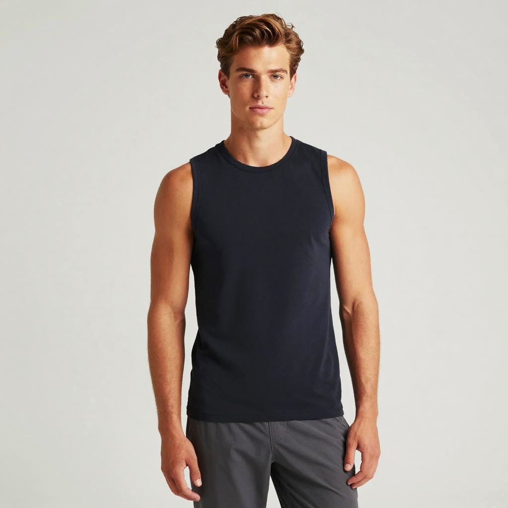 A young man models a simple black sleeveless tank top paired with dark gray pants against a plain, light background. The minimalistic and casual style emphasizes fitness and comfort, making it suitable for activewear or casual summer fashion.