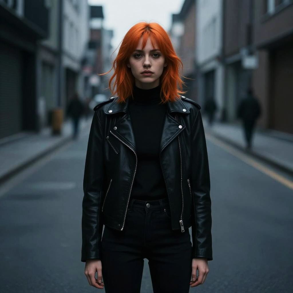A woman with vibrant orange hair stands confidently in the middle of a deserted urban street, wearing a sleek black leather jacket and black outfit. The moody background and her intense expression highlight a modern, edgy style with a slight punk influence.