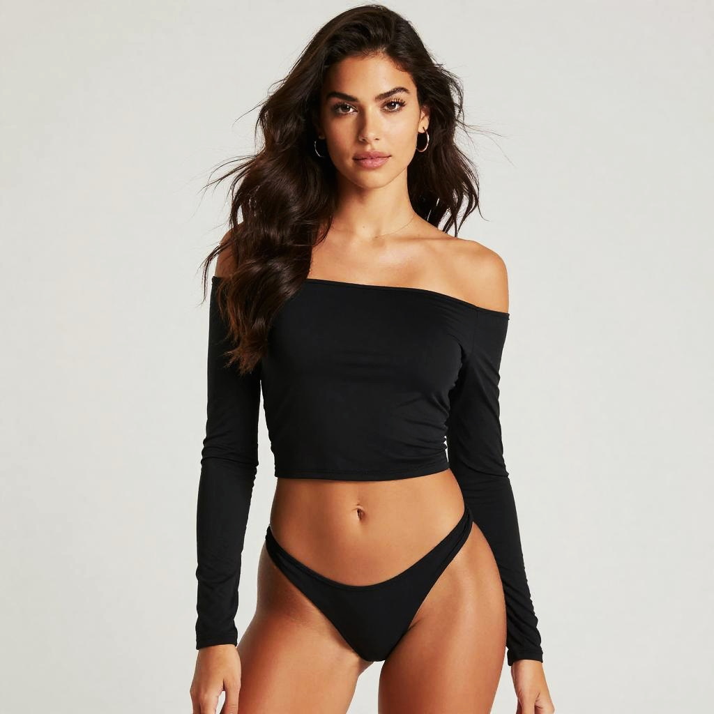Confident Woman in Black Off-Shoulder Crop Top and Bikini Bottoms
