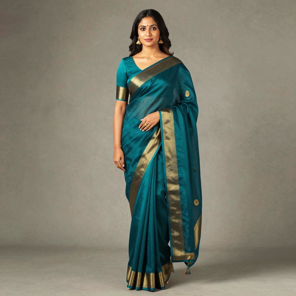 A woman elegantly dressed in a traditional teal saree with gold border detailing stands confidently against a neutral backdrop. Her poised expression and classic styling highlight the rich texture and cultural heritage of the saree.