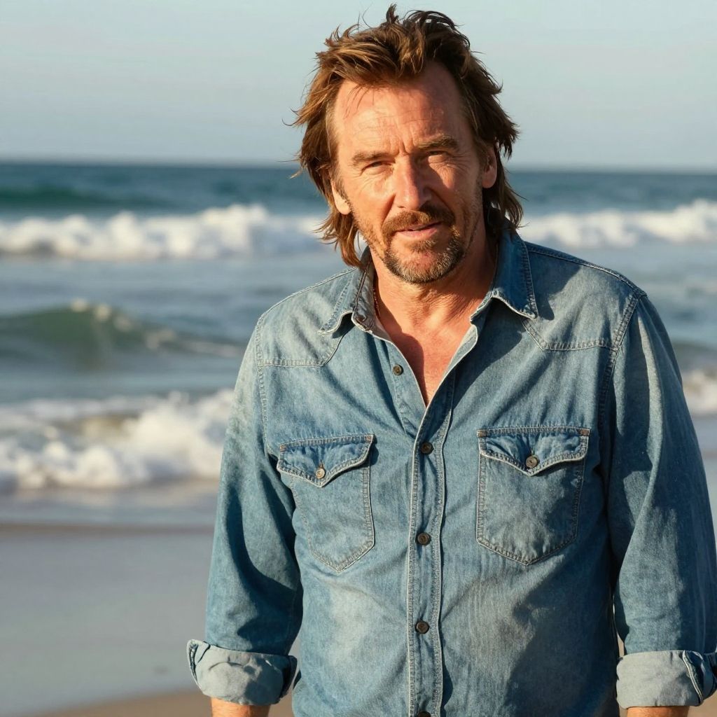 A middle-aged man with a rugged beard and tousled hair stands relaxed by the beach, dressed in a casual denim shirt with rolled-up sleeves. The background features gentle sea waves creating a serene coastal atmosphere under soft natural lighting.