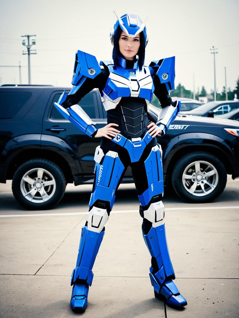 A woman dressed in a detailed, futuristic blue and white armored suit inspired by the character Arcee from the Transformers series. The outfit features sleek, robotic design elements with a helmet, shoulder armor, and plated leg guards, standing confidently in an outdoor urban setting with parked SUVs in the background.