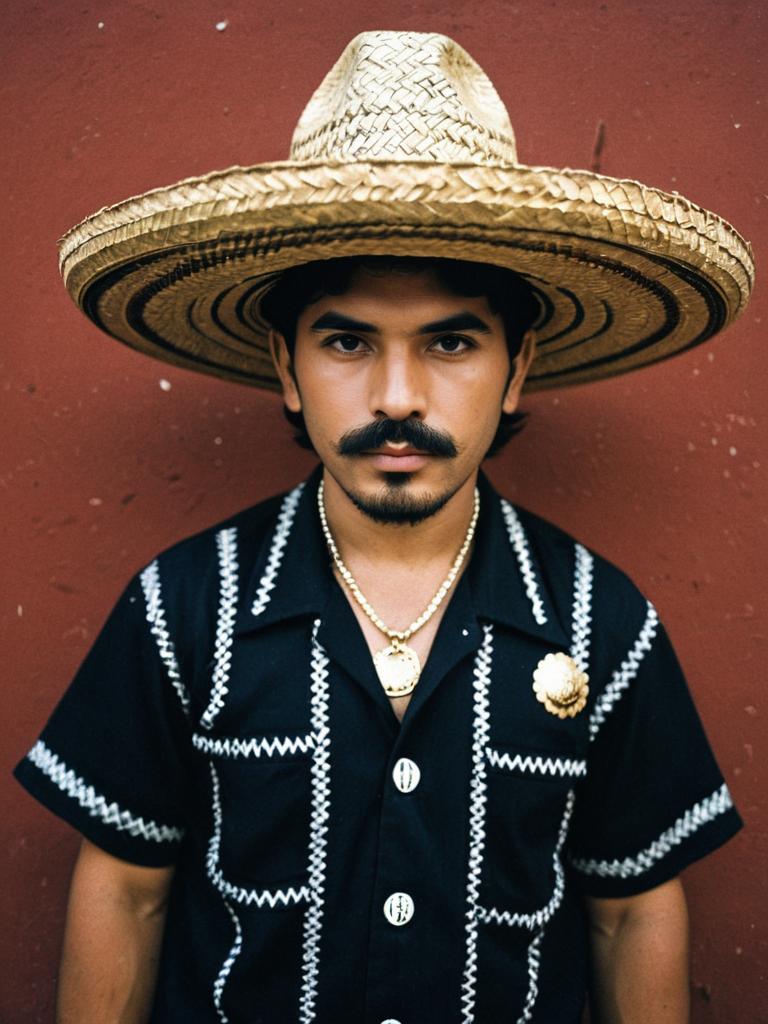 Mexican Cholo Costume Portrait of Man Wearing Sombrero and Black Shirt