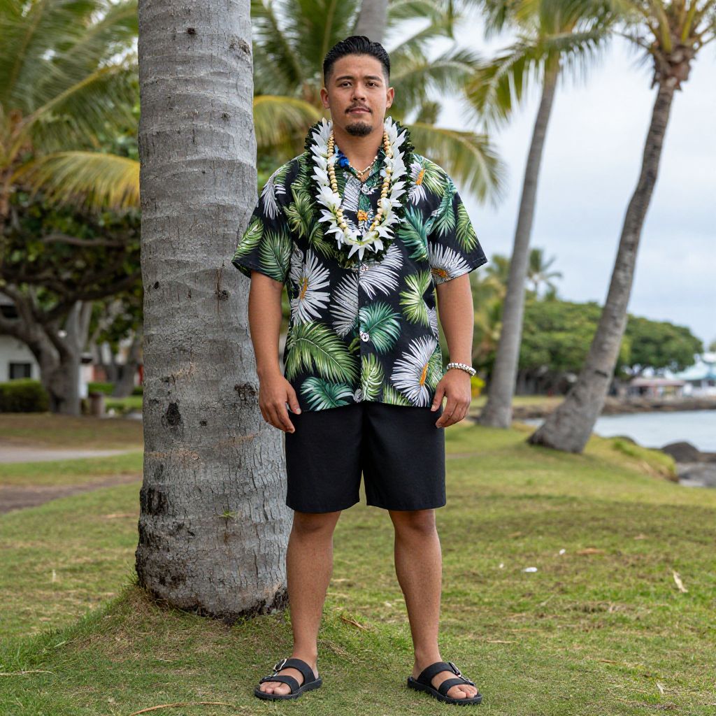 A man stands confidently by a palm tree wearing a vibrant Hawaiian shirt with a tropical leaf pattern, black shorts, and sandals. He accessorizes with a white flower lei and shell necklace, embodying a relaxed island vibe against a backdrop of palm trees and a coastal setting.