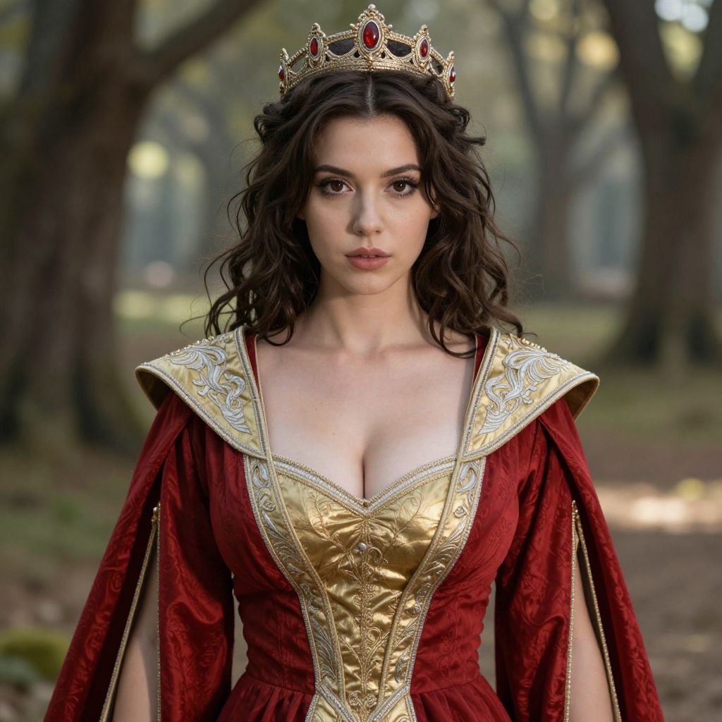 A woman dressed as a medieval queen stands in a forest setting, wearing an elaborate red and gold gown with intricate embroidery. She has long, wavy hair topped with a jeweled golden crown, exuding regal elegance and strength.