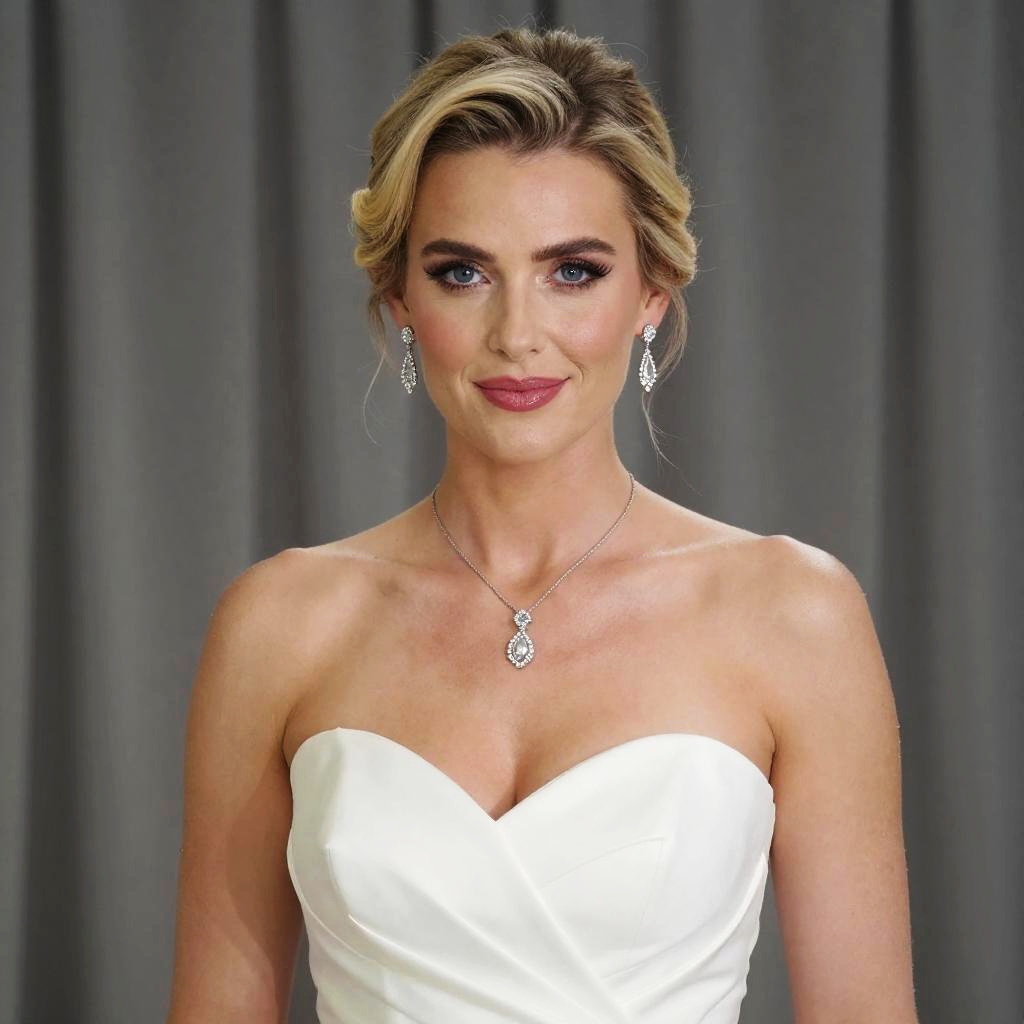 A beautiful woman wearing a strapless white gown, posing elegantly against a neutral grey backdrop. She has her blonde hair styled in soft waves and accessorized with sparkling drop earrings and a matching pendant necklace, exuding a classic bridal or formal look.