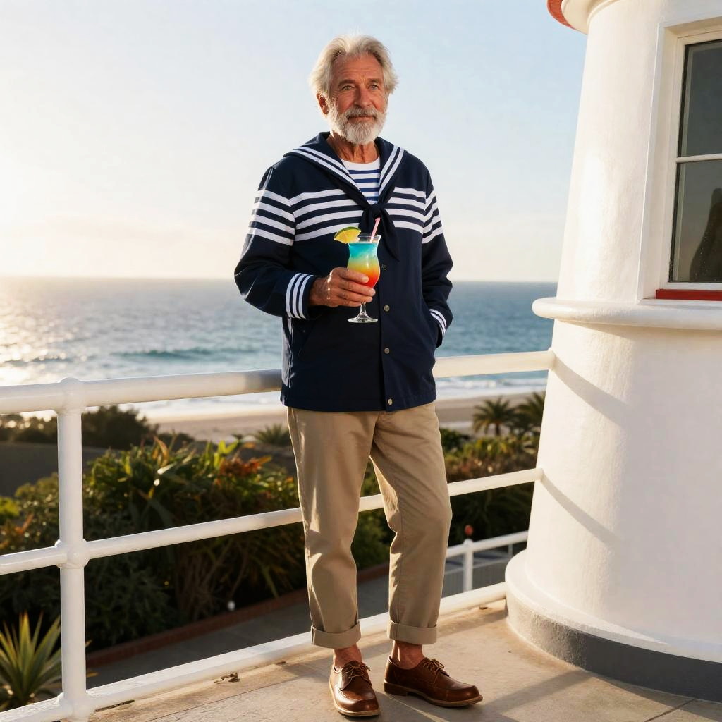 An older man with gray hair and a beard stands confidently on a terrace overlooking the ocean at sunset, holding a colorful tropical cocktail. He is dressed in a classic nautical style with a navy blue sailor sweater featuring white stripes, beige cuffed trousers, and brown leather shoes, capturing a relaxed yet sophisticated seaside vibe.