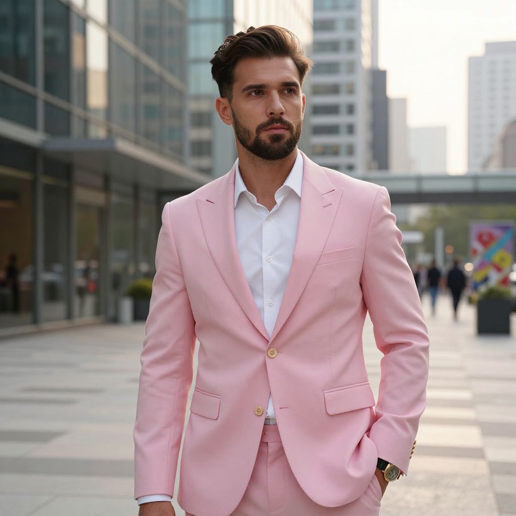 Confident Man in Stylish Pink Suit Walking in Urban Cityscape