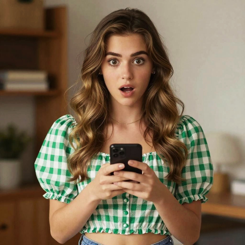 A young woman with wavy brown hair wearing a green and white checkered puff sleeve crop top holds a smartphone with a surprised expression. The indoor setting is softly lit, creating a warm, natural atmosphere.