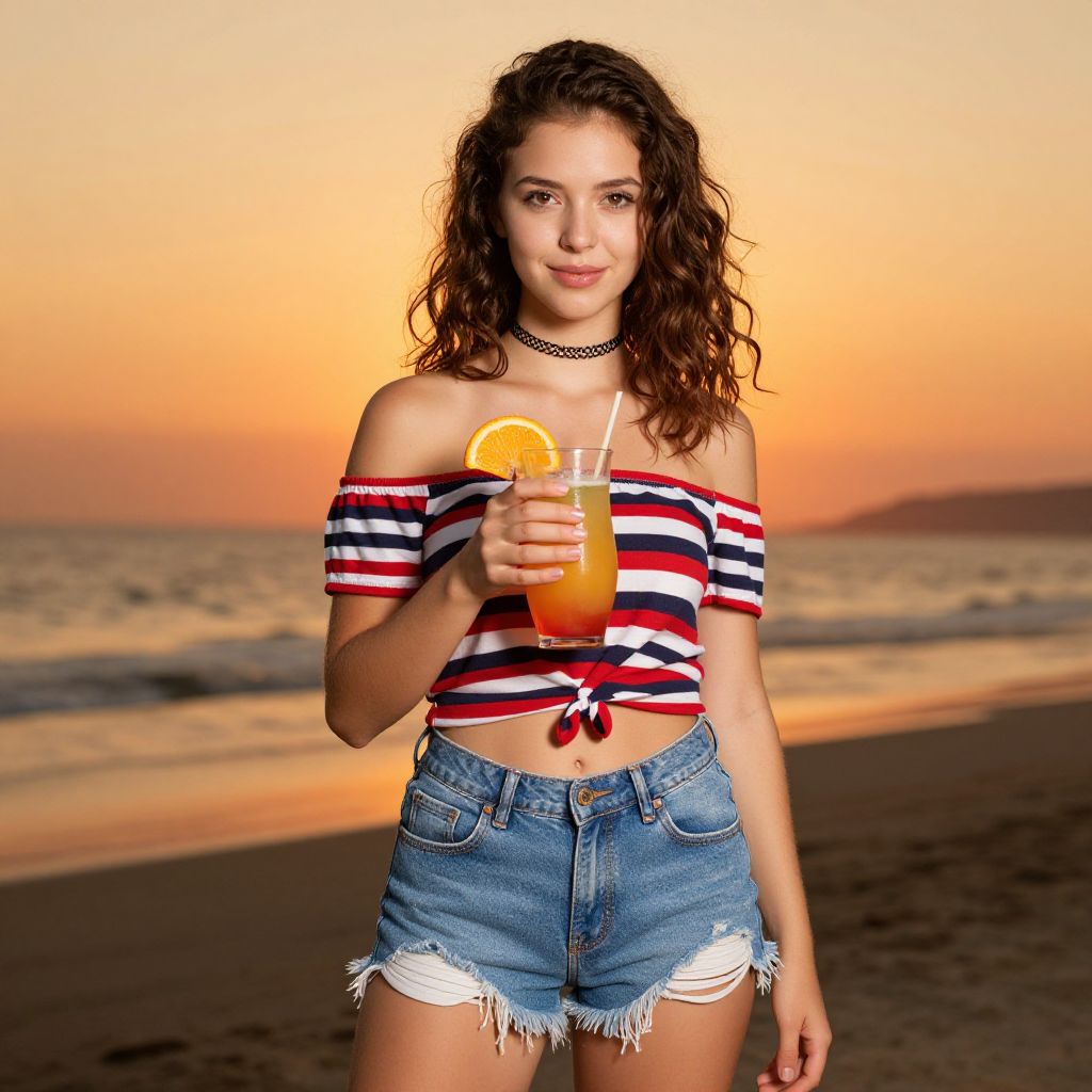 A young woman stands on the beach at sunset wearing a striped off-shoulder top and denim shorts, holding a refreshing cocktail garnished with an orange slice. The warm glow of the setting sun casts a beautiful backdrop, creating a relaxed and summery atmosphere.