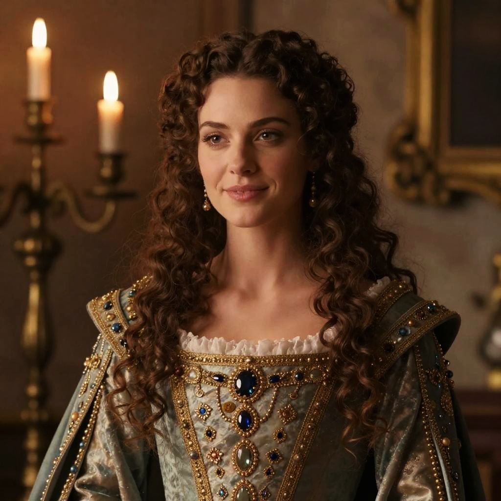 A woman dressed in an elaborate Renaissance-style gown adorned with intricate gold embroidery and jeweled embellishments smiles softly against a warmly lit, classic interior background featuring ornate candle holders. Her curly hair and period-accurate attire evoke the elegance and charm of historical European nobility.