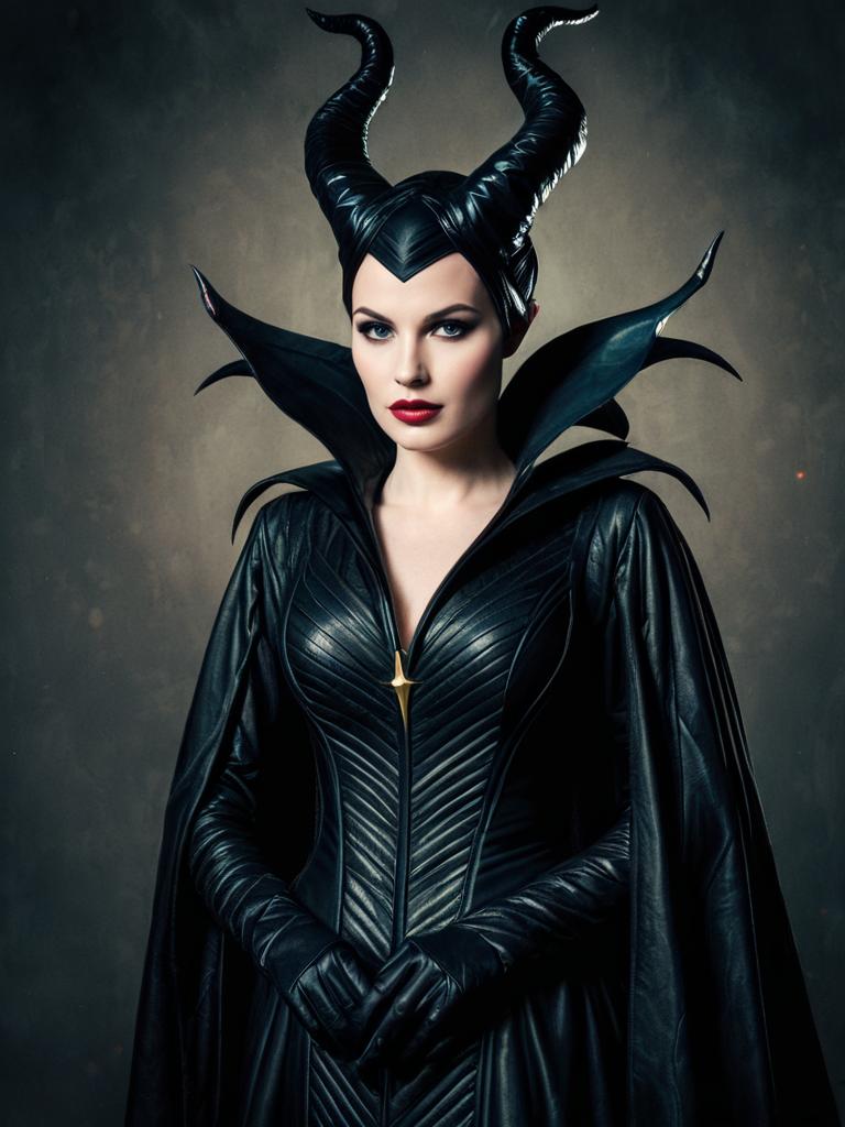 A woman is dressed in a detailed Maleficent-inspired costume featuring a sculpted black leather bodice and high collar. She wears the iconic horned headpiece and striking makeup with bold red lips, creating a powerful and enchanting fantasy character portrait.