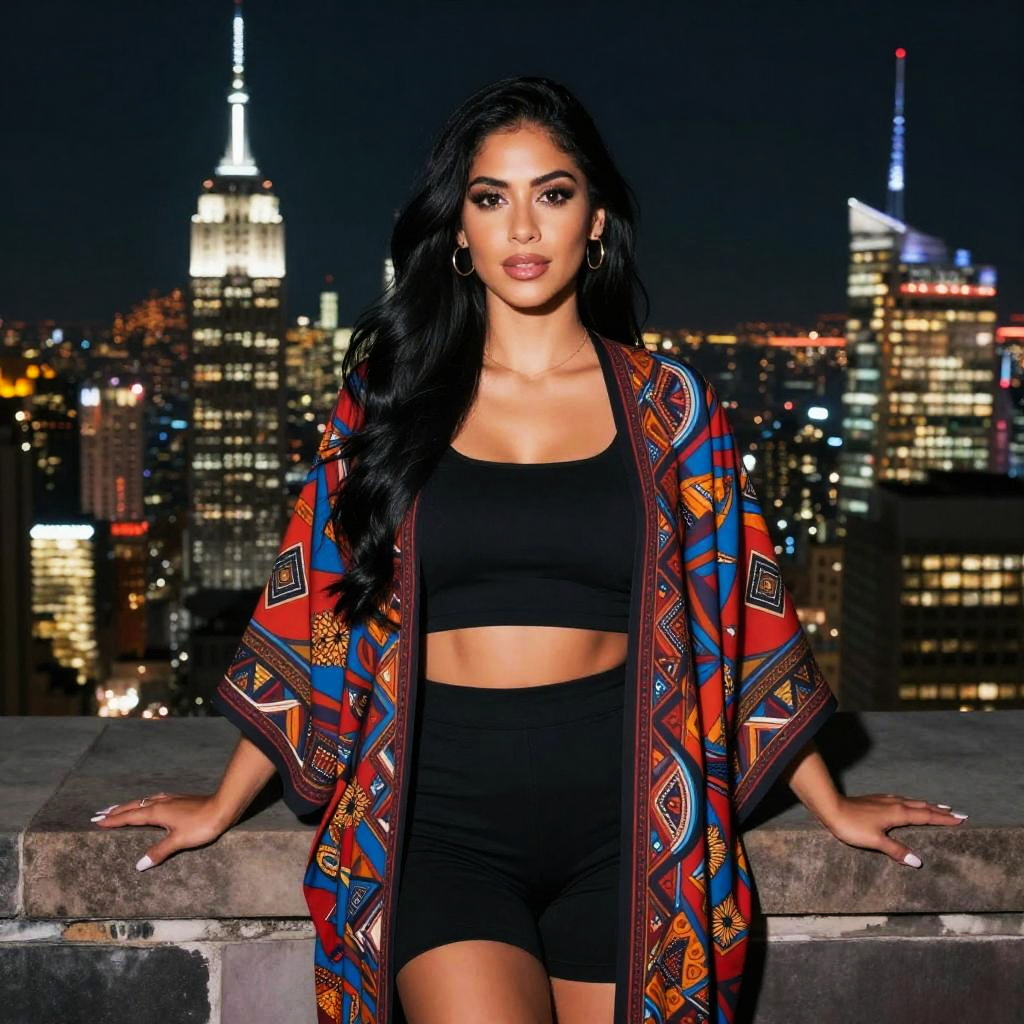 A confident woman poses on a rooftop at night with a stunning city skyline behind her, featuring illuminated skyscrapers including the Empire State Building. She wears a vibrant, patterned kimono over a black crop top and shorts, exuding a modern and stylish vibe with sleek, long black hair and subtle makeup.