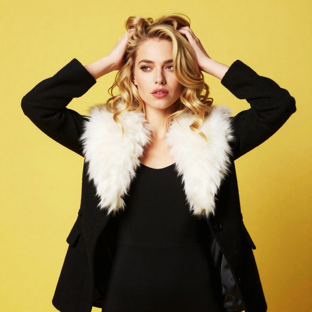 A stylish woman poses against a bright yellow background wearing a chic black coat with a luxurious white fur collar. Her blonde hair is styled in loose waves, and she exudes confidence with her hands gently tousling her hair.