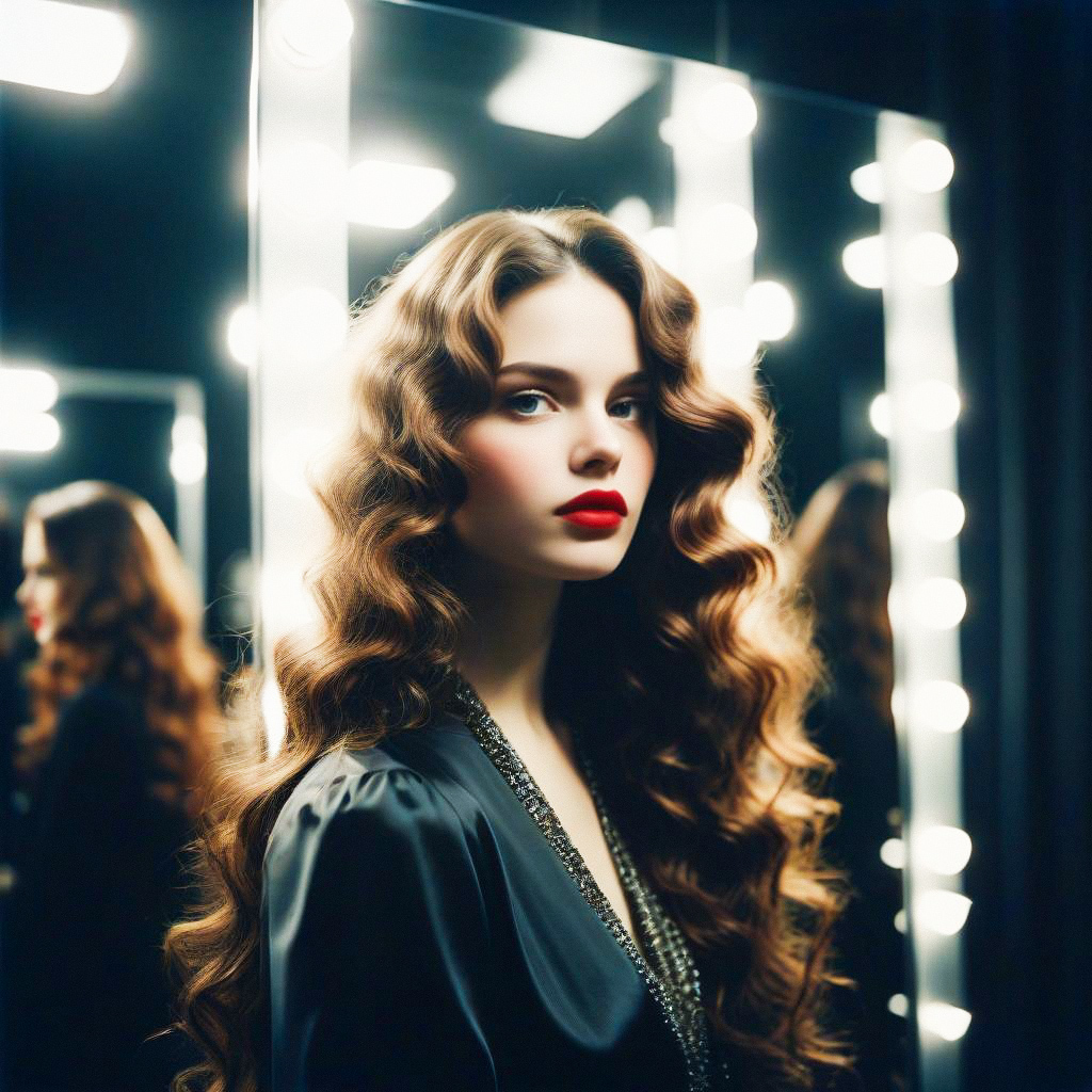 A woman with vibrant red hair styled in an elegant updo poses confidently in front of a vanity mirror framed with bright lights, wearing a vintage-inspired, high-neck dress with floral sleeves. The image captures a dramatic, cinematic mood with deep shadows and sharp highlight contrasts, emphasizing her striking makeup and sophisticated expression.