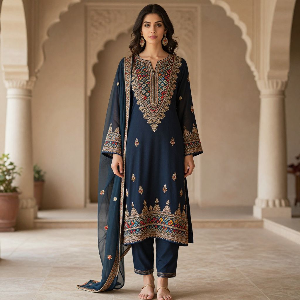 A woman showcases a traditional navy blue embroidered salwar kameez with intricate multicolored threadwork and gold detailing. The outfit is complemented by a matching dupatta draped over one shoulder, blending classic South Asian fashion with elegant sophistication in a historic architectural setting.