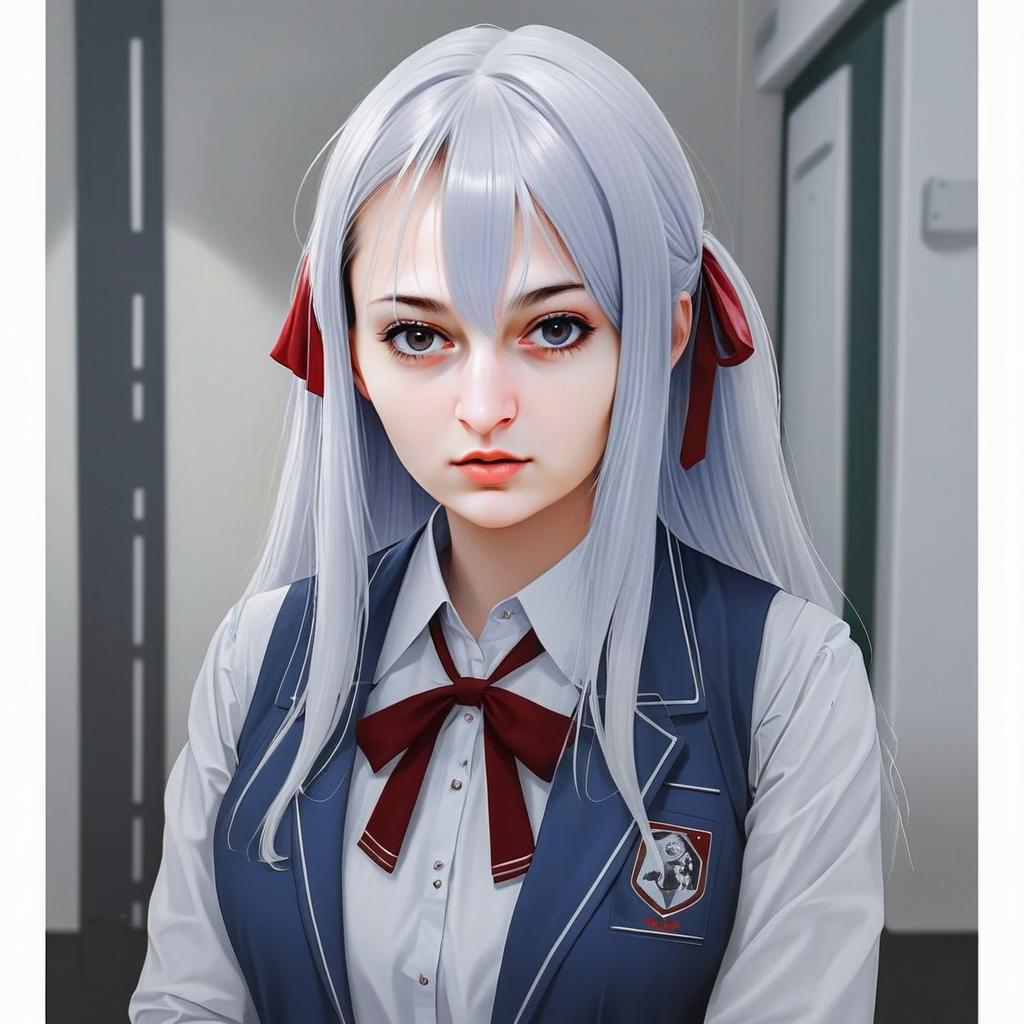 This digital anime-style portrait features a young woman with long silver hair tied with red ribbons, dressed in a detailed school uniform consisting of a navy blue vest and a red bow tie. The artwork showcases realistic texturing and shading while maintaining the characteristic large eyes and smooth skin typical of the anime genre, set against a subdued indoor background.