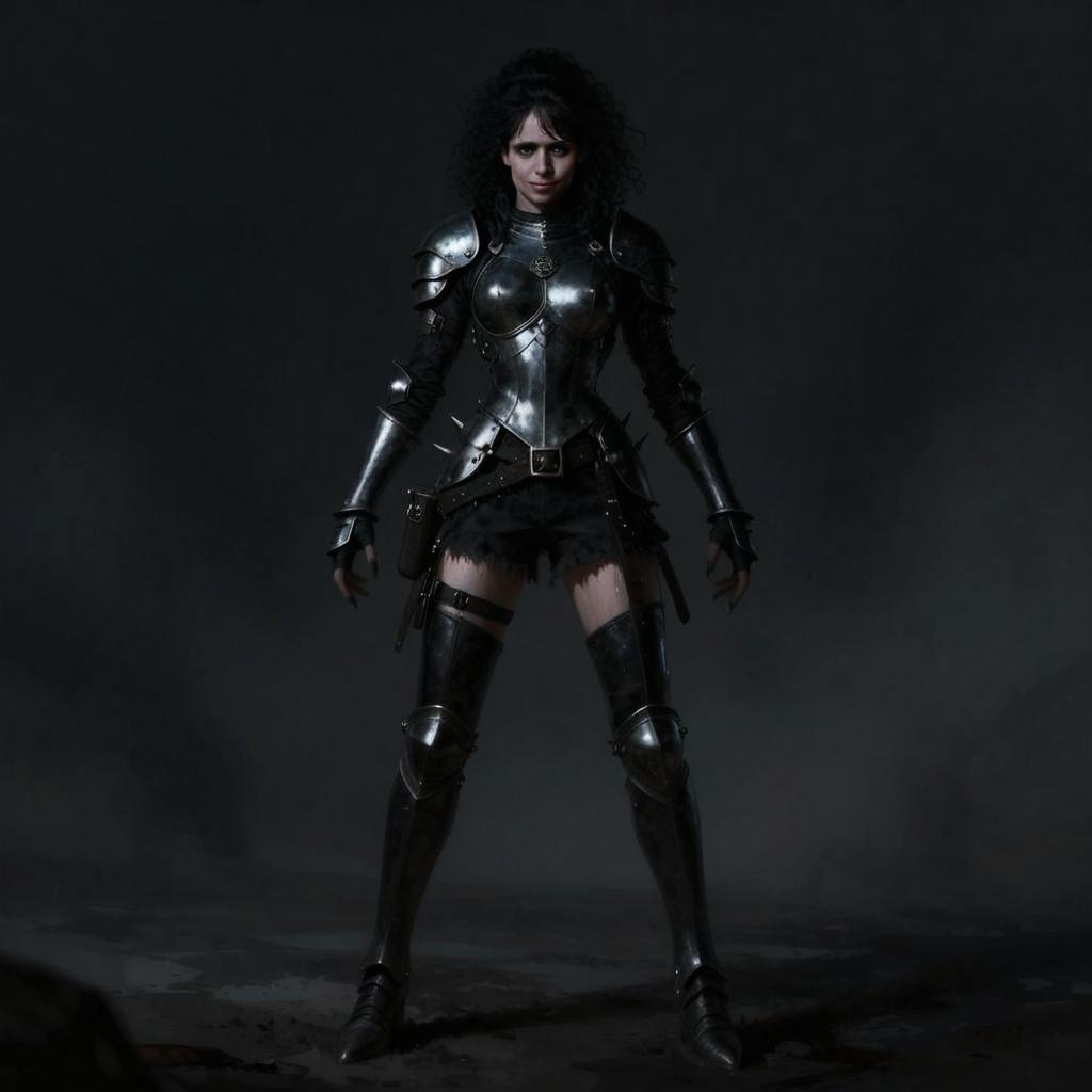 A fierce woman stands confidently dressed in stylized medieval armor with a dark, edgy aesthetic. Her curly hair contrasts sharply with the shiny metal plates, blending a modern gothic vibe with classic warrior elements in a dramatic, moody setting.