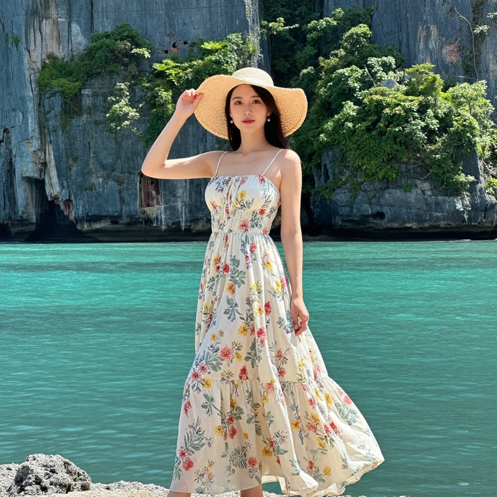 A woman stands gracefully by the turquoise waters near a rocky, lush green cliff. She wears a floral maxi dress and a wide-brimmed straw hat, capturing a serene and elegant summer vibe.