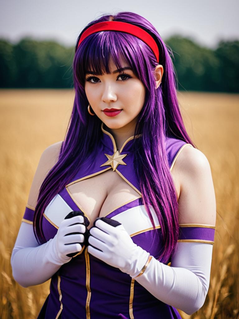 Asamiya Athena Cosplay Portrait with Purple Hair in Outdoor Wheat Field