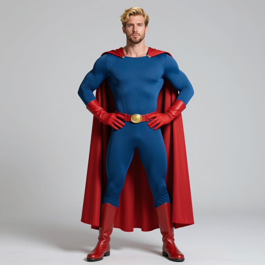 A confident man poses in a classic superhero costume featuring a blue bodysuit, red cape, gloves, belt, and boots. The outfit emphasizes a traditional comic book superhero style with a modern clean look.