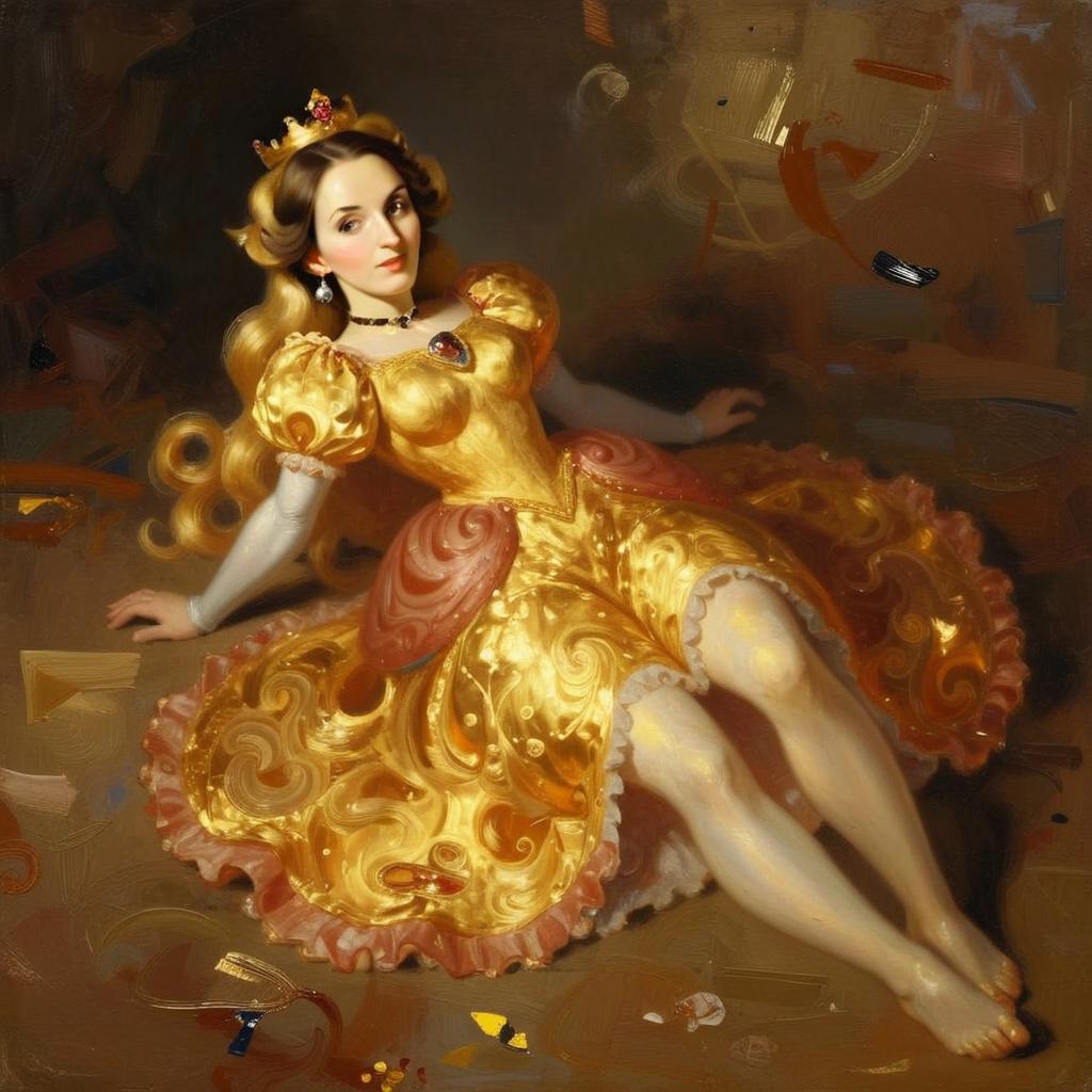 A woman dressed as a royal princess reclines gracefully, wearing an ornate golden gown with intricate swirling patterns and adorned with a small crown. The image showcases a classical painting style with smooth brushstrokes and rich color tones that enhance the elegant and regal atmosphere.
