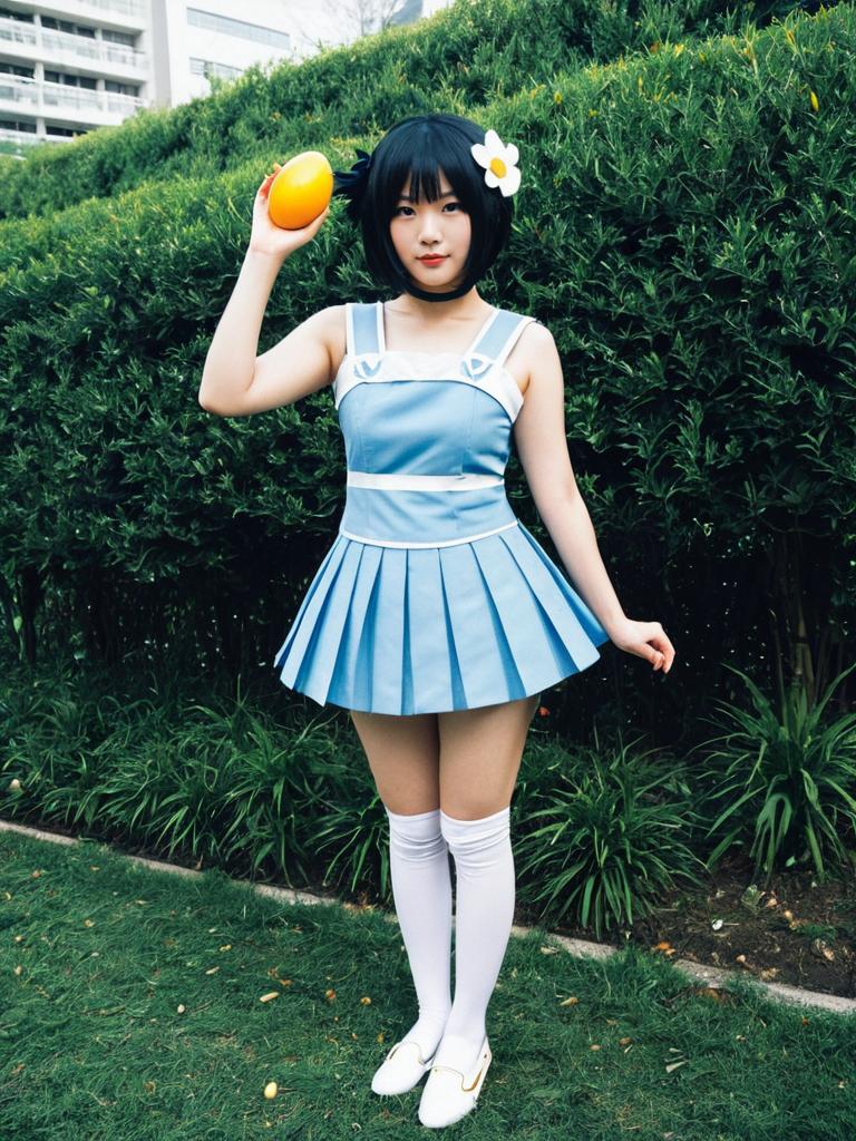 A woman dressed as Tsukihi Araragi from the anime series displays a charming pose outdoors against a lush green hedge. She wears a light blue pleated dress with white accents, white thigh-high socks, and a black short bob wig adorned with a white flower, holding a yellow prop resembling an egg.