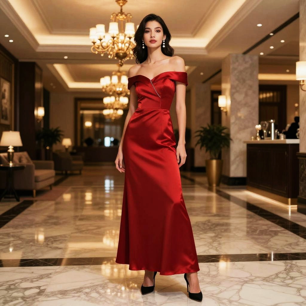A woman poses elegantly in a luxurious setting wearing a stunning off-shoulder red satin gown. The sophisticated ambiance is enhanced by warm ambient lighting and marble flooring, highlighting the glamour of the formal attire and graceful styling.