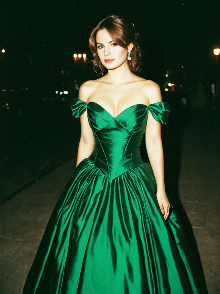 A woman stands confidently outdoors at night wearing an elegant green evening gown with off-the-shoulder sleeves and a structured bodice. The dress features a full, flowing skirt made of shiny satin fabric, capturing a classic and sophisticated style reminiscent of vintage glamour.
