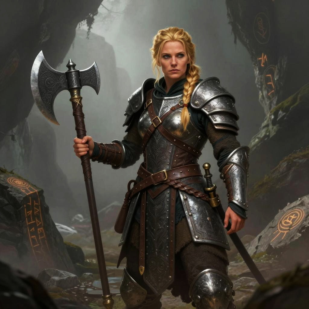 A determined woman warrior stands in a misty, rune-carved forest, clad in intricately detailed medieval armor and gripping a large battle axe. Her blonde braid and intense expression convey strength and readiness, capturing a powerful fantasy warrior aesthetic.