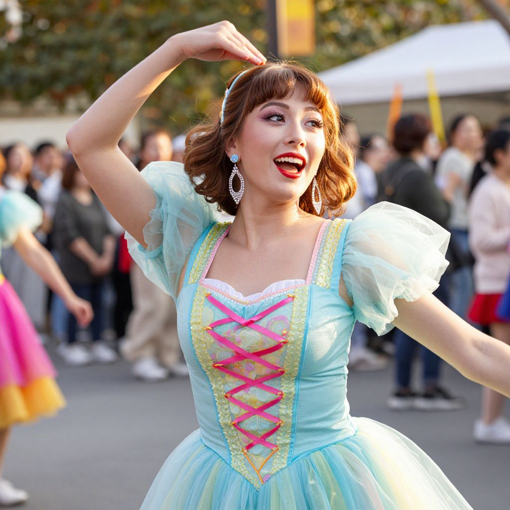 A joyful woman dressed in a vibrant blue and yellow fairy-tale style costume performs a lively dance in an outdoor setting. She wears sparkling earrings and bright makeup, capturing the festive and theatrical atmosphere of the event.