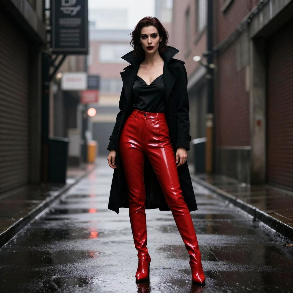 A confident woman stands in a wet urban alleyway wearing striking red patent leather pants paired with a black top and long black coat. The moody atmosphere and her bold fashion choices highlight contemporary edgy street style with a touch of high fashion elegance.