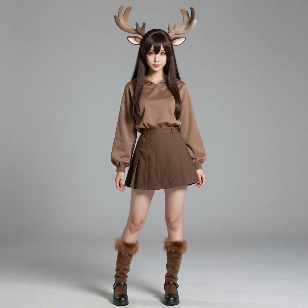 A young woman dressed in a moose-inspired costume featuring large antler headbands and fur-trimmed boots, styled in a cozy, autumnal brown outfit with a pleated skirt and long-sleeve top. This cosplay draws influence from the Kemono Friends series, embodying a cute and playful animal character look with a modern, casual fashion twist.