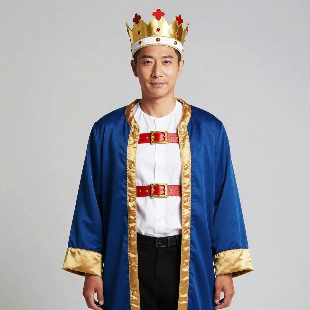 Man in Regal King Costume with Blue and Gold Robe and Crown