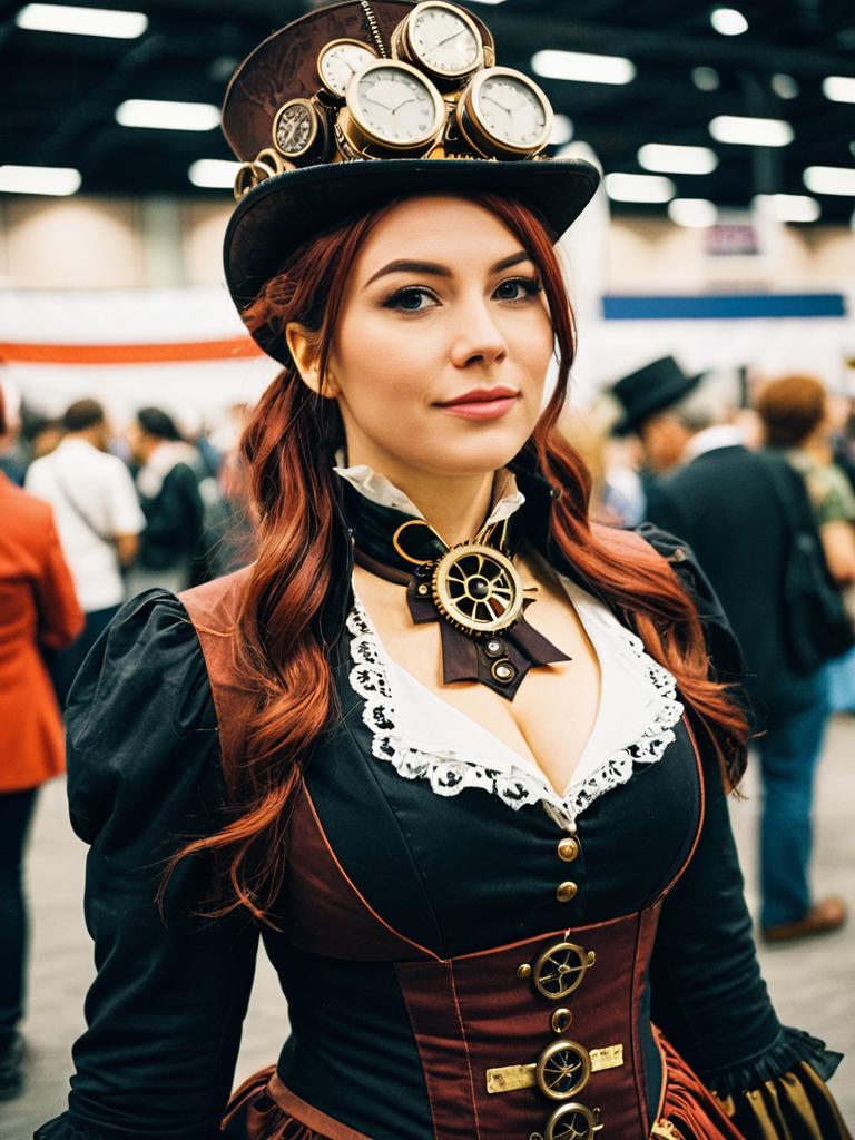 Woman in Steampunk Lady Costume Candid Cosplay Portrait at Themed Convention