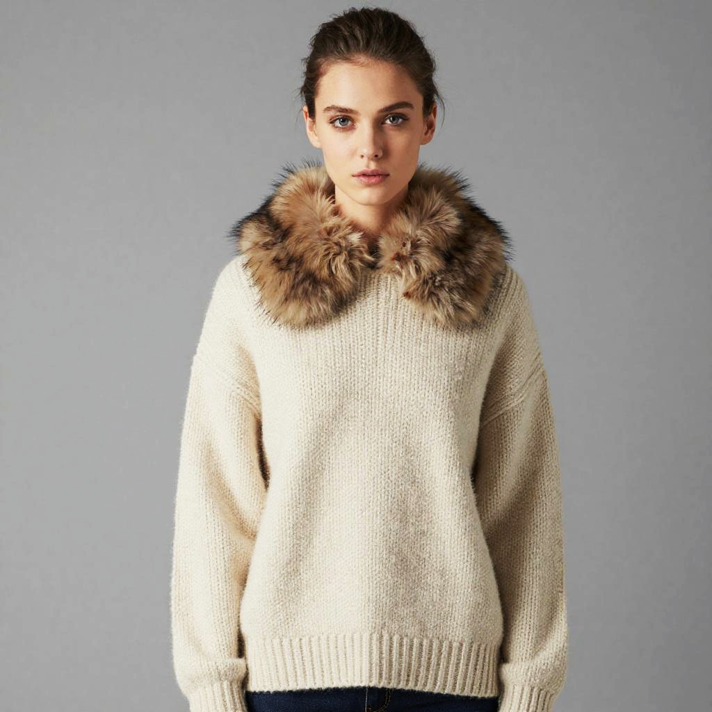 A young woman models a cozy, cream-colored knit sweater featuring a luxurious fur collar, set against a simple gray backdrop. The image highlights a modern, minimalist fashion style emphasizing warmth and texture. Her neutral expression and natural makeup complement the timeless, elegant look of the garment.
