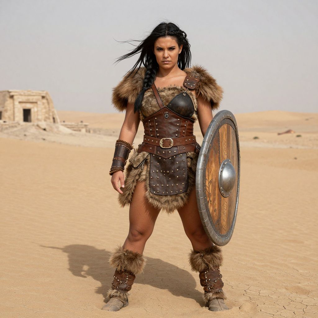 A fierce woman warrior stands confidently in a desert landscape, dressed in rugged Viking-style leather and fur armor while holding a large round wooden shield. Her intense gaze and braided hair enhance the powerful and battle-ready look against a backdrop of sandy dunes and an ancient stone structure.