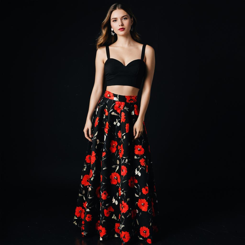 The woman models a contemporary evening wear ensemble featuring a black cropped sweetheart top paired with a long, flowing black skirt adorned with vibrant red floral patterns. The outfit blends modern chic with elegant floral motifs, perfect for stylish night events or formal gatherings.