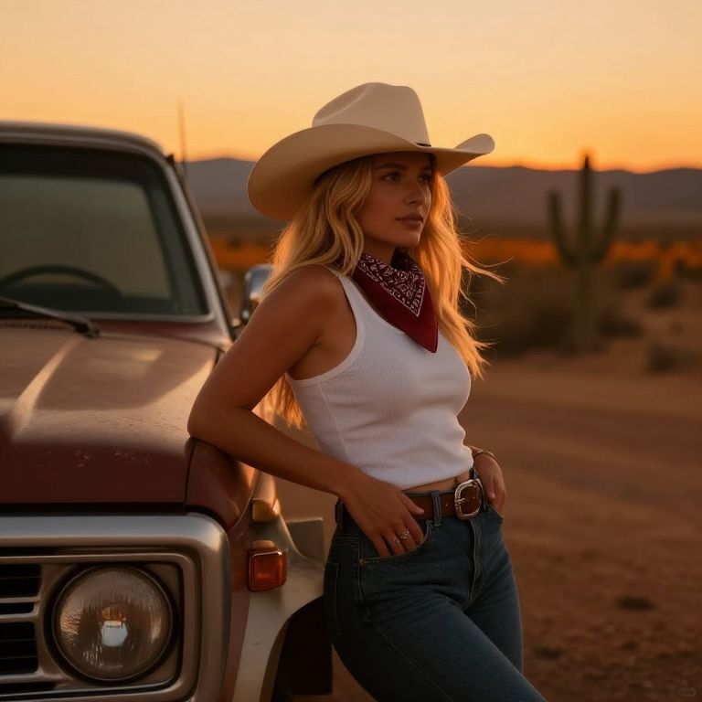 A woman dressed in a cowboy hat, white tank top, and red bandana leans casually against a vintage truck in a desert landscape during sunset. The warm lighting and rugged scenery evoke a classic Western style ambiance.