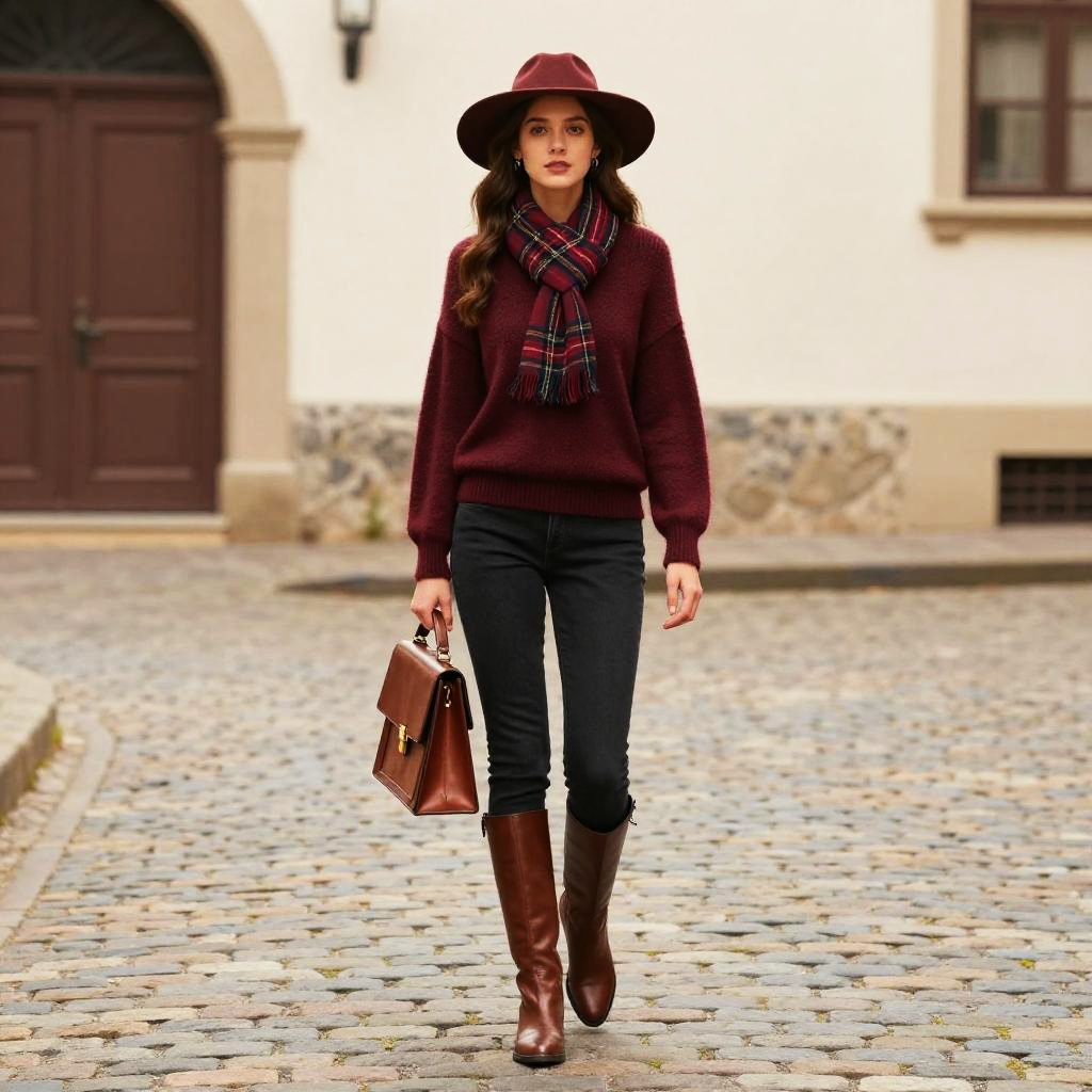 A woman confidently walks on a cobblestone street dressed in a chic fall outfit featuring a burgundy sweater, matching wide-brim hat, plaid scarf, black skinny jeans, and tall brown boots. She carries a stylish brown leather handbag, perfectly blending casual elegance with seasonal fashion in an urban setting.