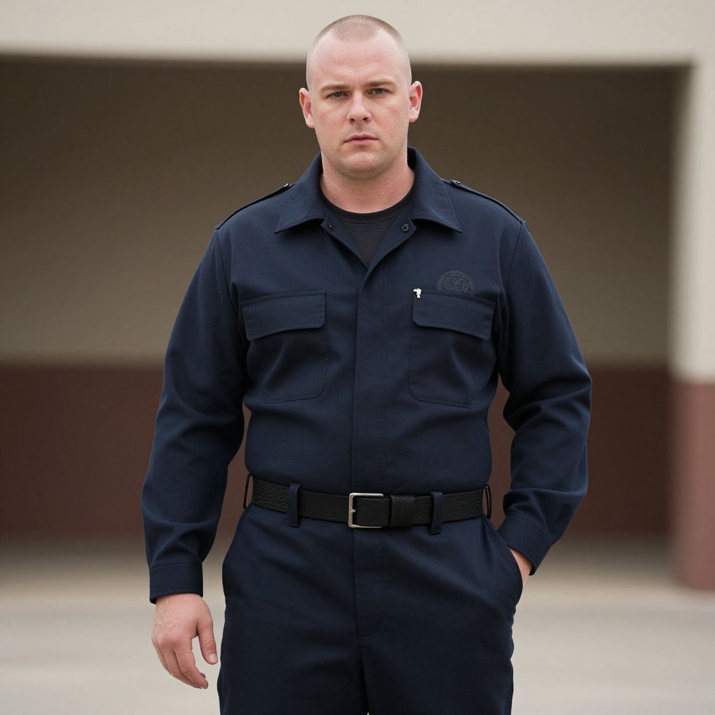 A serious man in a dark blue security uniform stands confidently with one hand in his pocket against a blurred neutral background. The image conveys professionalism and authority, highlighting the practical design of the uniform.